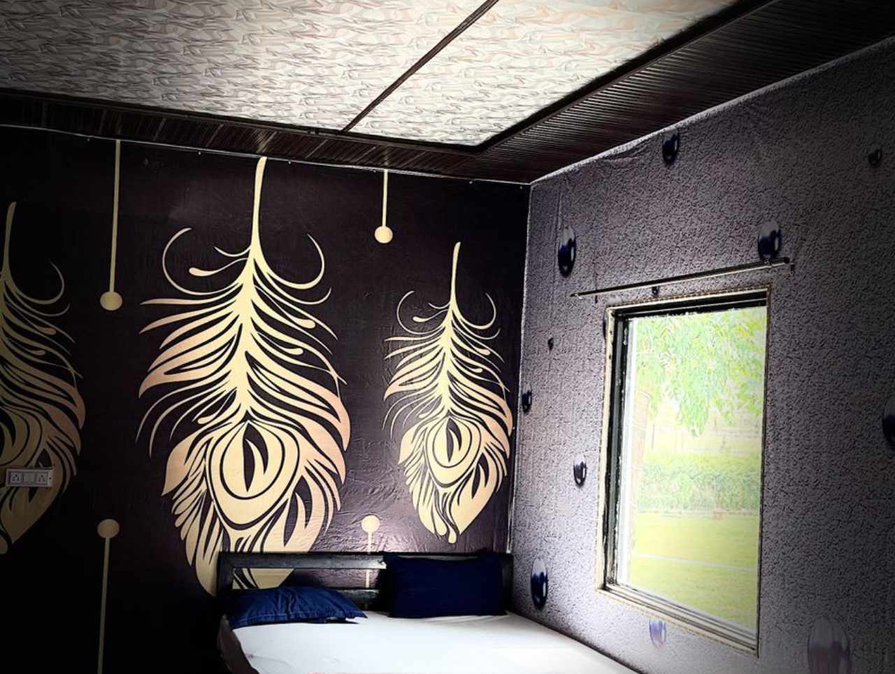 The Swiss Cottage provides enhanced comfort These are high-quality, weather-proof fabric tents (Swiss Tents) built on a solid platform. They offer a "glamping" feel that brings you closer to nature.Despite being tents, they come with a double bed, charging points, and essential furniture. Most importantly, they include an attached western-style washroom